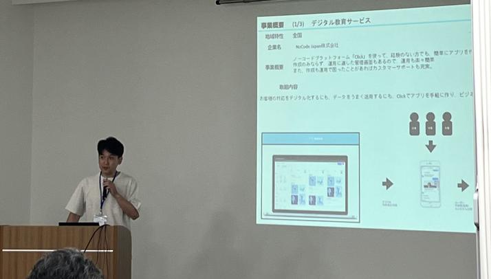 セミナーでは、弊社サービスであるノーコードアプリ開発ツール「Click」を使ったデジタル教育サービスについて紹介しました。